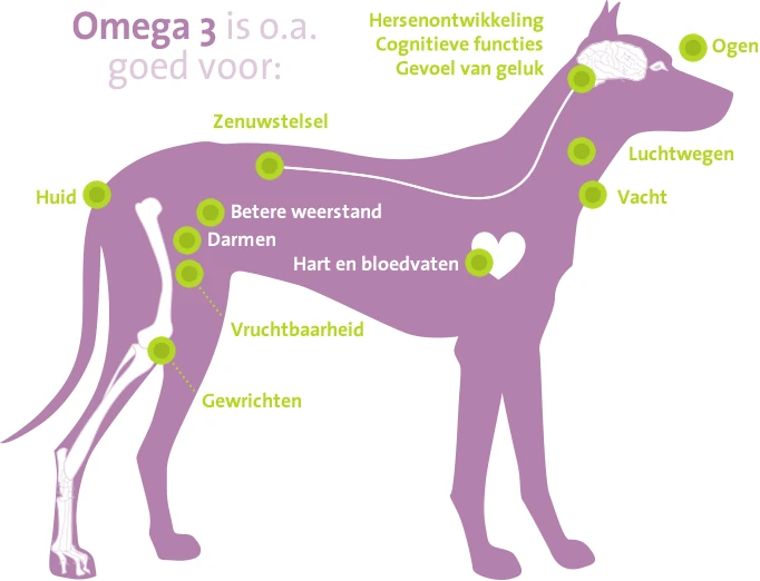 Omega-3 vetzuren kunnen bijdragen aan de algehele ondersteuning van de gezondheid van uw hond, waaronder een gezonde vacht en hersenfunctie. Het kan een nuttige aanvulling zijn op een gebalanceerd dieet.