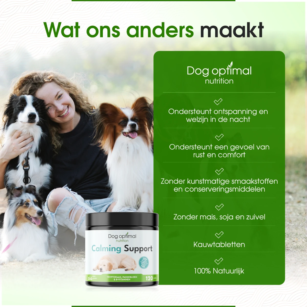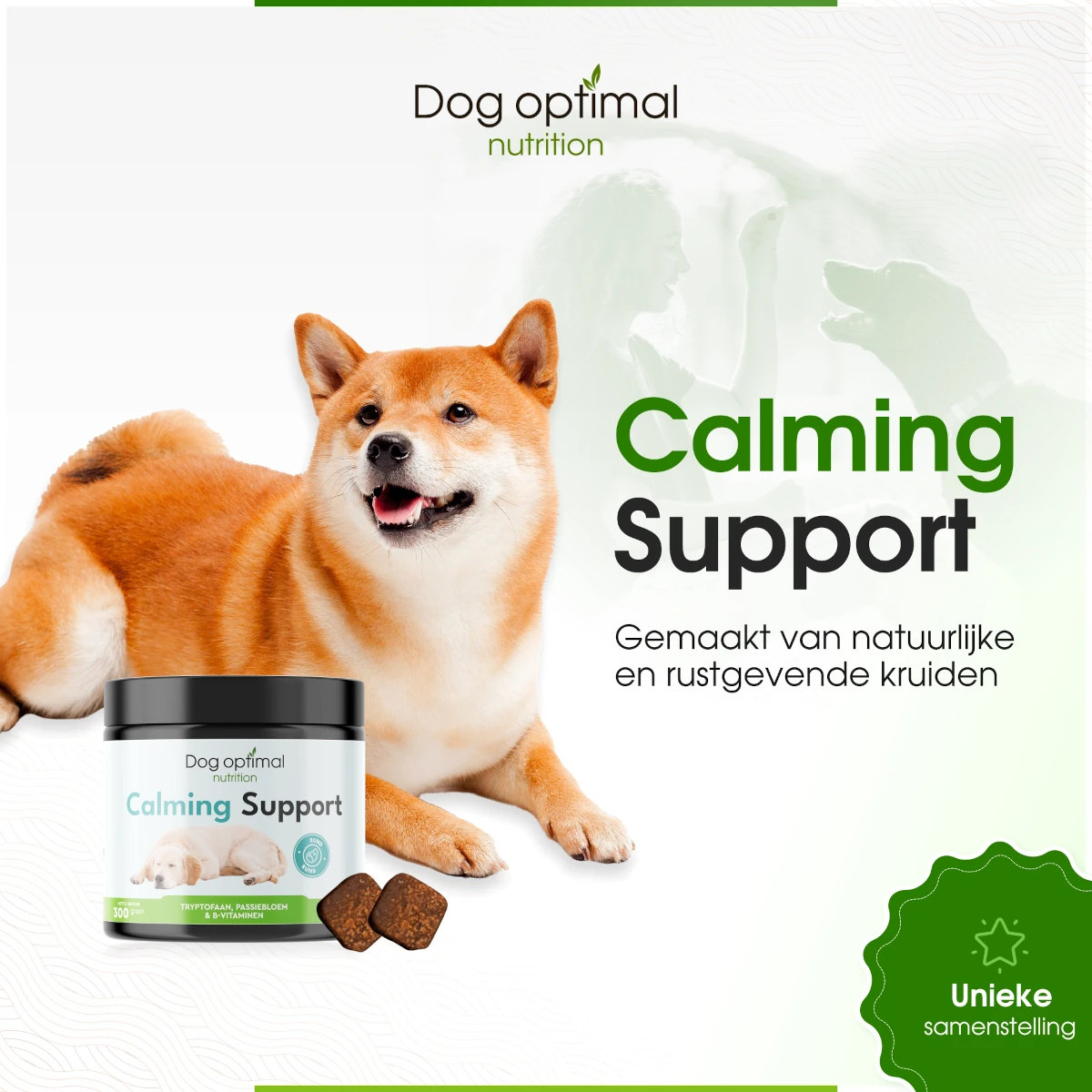Ondersteun een kalme en vredige gemoedstoestand voor je hond met onze natuurlijke mix van ingrediënten.