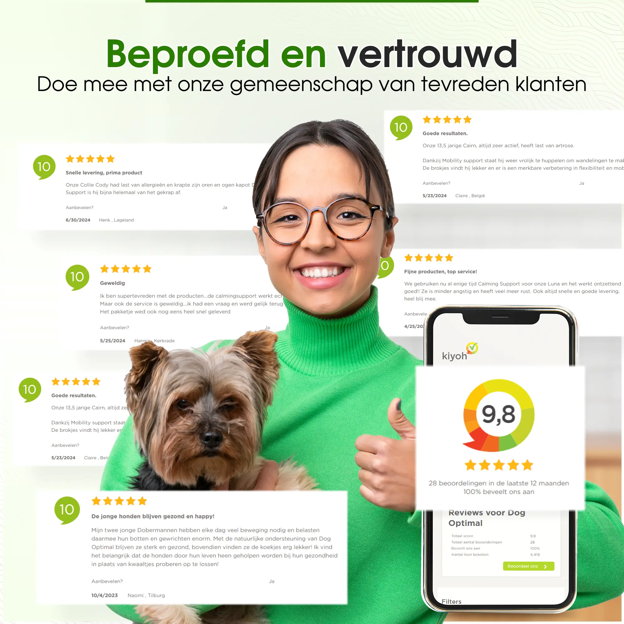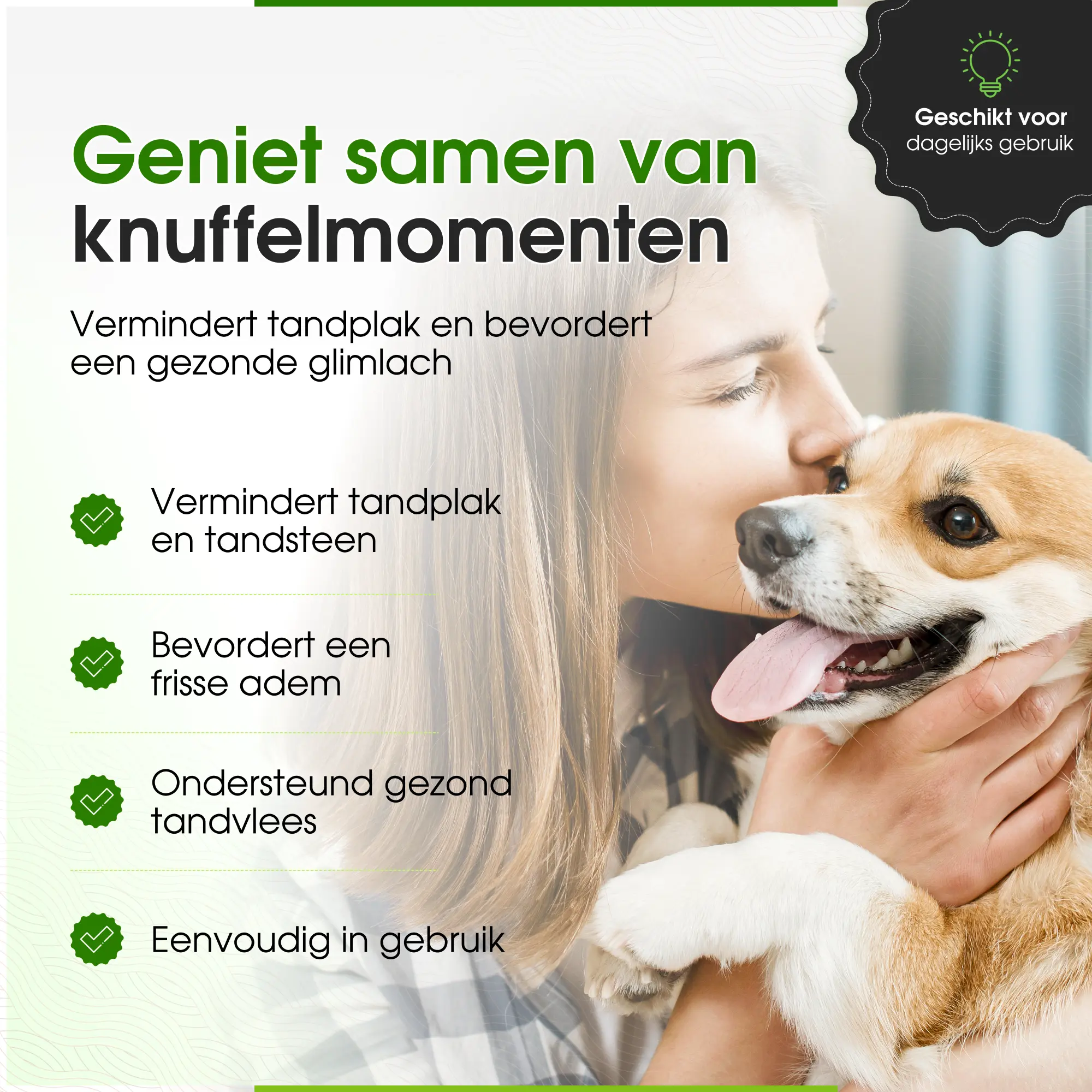 Een goede algemene gezondheid kan een positieve invloed hebben op het stressniveau van je hond. Onze supplementen ondersteunen hier. Zo helpt onze Vlooi en Teek bij het voorkomen van parasieten, en ondersteunt Dental Water de mondhygiëne van je hond.