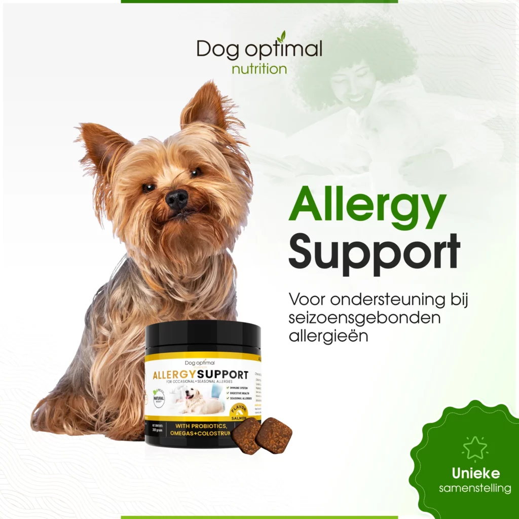 Dog Optimal’s Allergy Support is een supplement dat speciaal is ontwikkeld om de symptomen van allergieën bij honden te verlichten en hun algehele welzijn te bevorderen. Hier zijn enkele redenen waarom dit supplement een goede keuze kan zijn voor je hond: